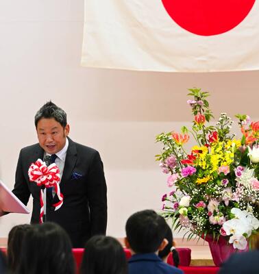 岩永牧人PTA会長からは、「宮田小は地域の方々が見守って下さっているので、安心して通える学校です。朝、お子様を見送る際、保護者からの気を付けての一言が交通事故抑制に繋がります。」というお話がありました。