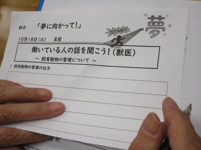 子どもたちは、仕事の内容だけでなく、「獣医になるにはどうすればいいか」や「働くときに求められる人とはどんな人か」も聞き取ります。