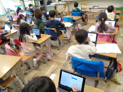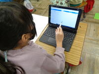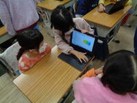 1年生、タブレットで「ジャストスマイル」!