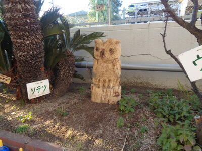 そして...チェーンソーアート作品の「宮ふくろう」さん、1年生の球根をカラスさんたちから守ってくれています!ありがとう!!