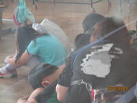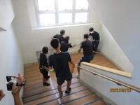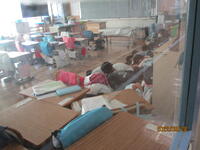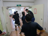 子どもたちは、先生の指示で、廊下側・ベランダ側の窓、扉を施錠し、机やいすでバリゲードを作りました。