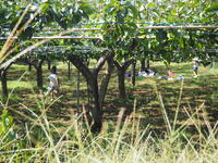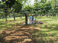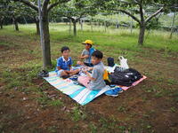 広大な梨畑、思い思いの場所にシートを広げてお弁当を。デザートに梨(王秋)を出していただきました。