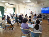 現地視察で学んだこと、地域や家庭とともに取り組み始めた減災教育の内容について、市内の先生方に向けて話をしました。