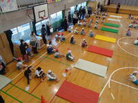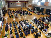 朝学習の時間、宮田っ子みんなが講堂へ