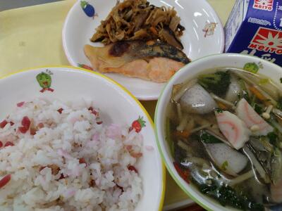 梅ご飯 鮭の西京焼き 切り干し大根含め煮 沢煮椀 牛乳