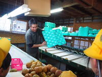 選果機も見学。梨はないので、いろいろな野菜を選果機に乗せ、重さによって分別される様子を見学しました。