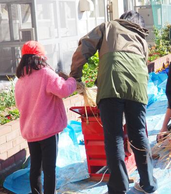まだまだあります、今日は3年生が収穫した稲の脱穀!