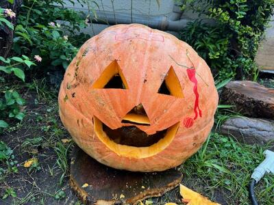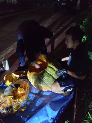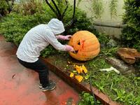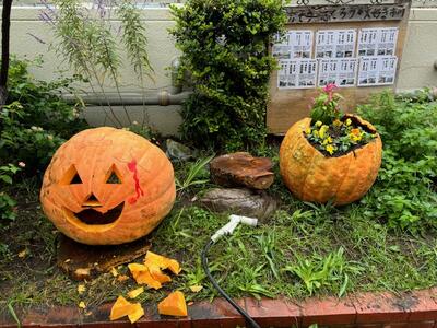 ↑こちらはホラー画像ではありません...ハロウィンを前に「お〇けカボチャ」の一つが爆発(中身が漏れてきちゃう現象)してしまい、岡本さんと地域の方と執行先生で中身をくりぬいているところです!感謝!!