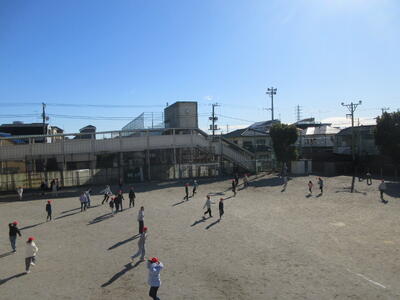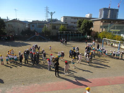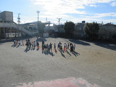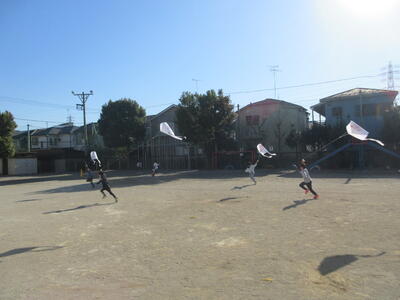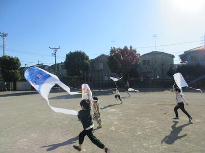 午後、1年生が元気よく校庭に出てきて自分で作った「たこ」を揚げて楽しんでいました。