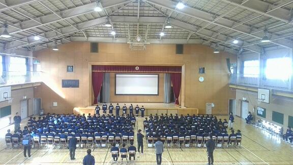 1,2年生の期末試験が終わり、全校集会を行いました。今回は2,3年生が体育館、1年