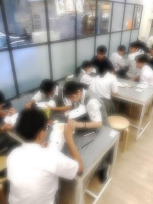 1年生のあるクラスでは、技術の時間に本棚(ラック)を制作していました。ベルトサンダーを使い、木材を器用に研磨していました。集中した表情から、ものづくりの楽しさが伝わってきます。