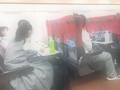楽しく充実した修学旅行も終わりに近づいています。金沢駅を予定どおり13時58分に出発しました。体調不良者はいません。生徒たちは楽しそうに過ごしています。