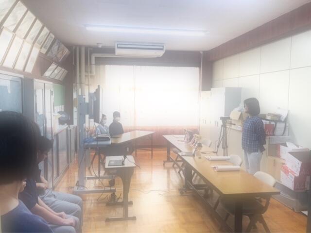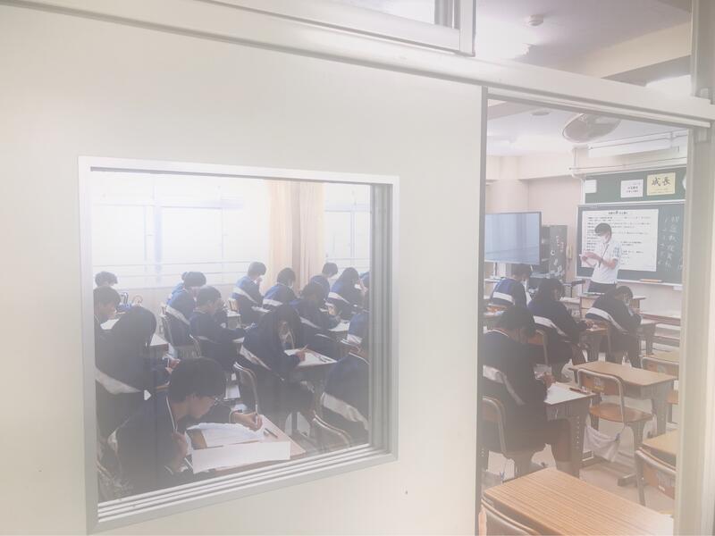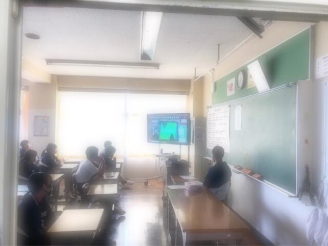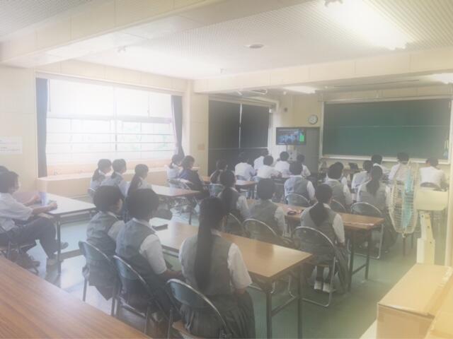 1学期期末試験最終日。社会と数学の試験終了後、リモートによる全校集会が行われました。生徒たちは大型モニターを見ながらの参加になりました。