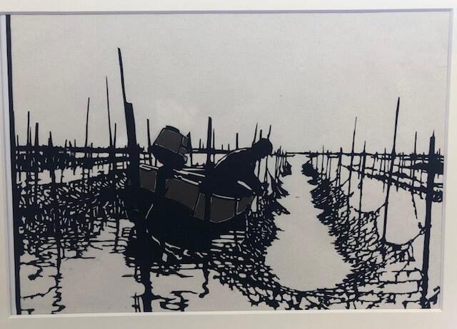 以下の写真は、橋本さんの作品をそのときに私が撮影したものです。橋本さんの作品には、本来白黒のみで表現する切り絵に色彩を取り入れているという特徴があります。