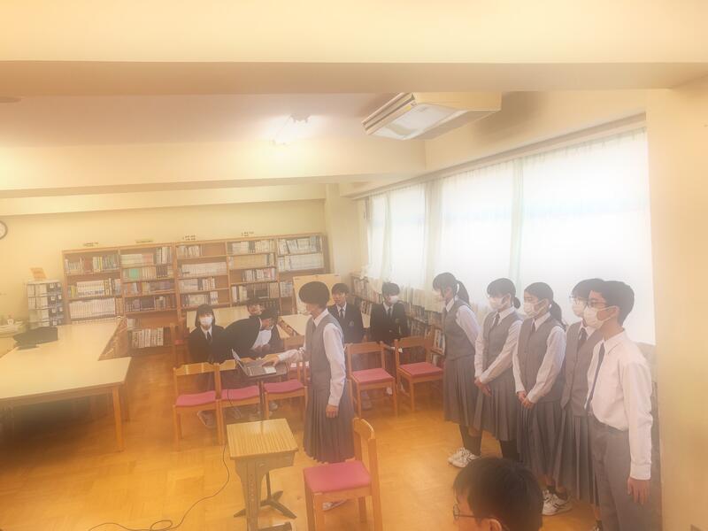 校外学習や今学期の振り返りについて、代表生徒が前に出て、全体に話をしました。