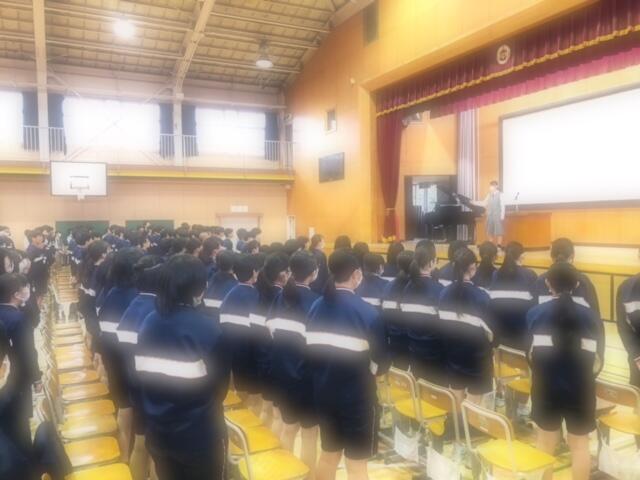 今日は3年生が体育館で、1・2年生は教室にいながらオンラインで開催しました。3年生だけの校歌合唱でしたが、体育館に響き渡る校歌に感動しました。