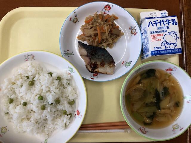 今日の給食は、「グリーンピースご飯」、牛乳、鯖の塩こうじ焼き、切り干し大根とあさりの含め煮、じゃが芋の味噌汁でした。