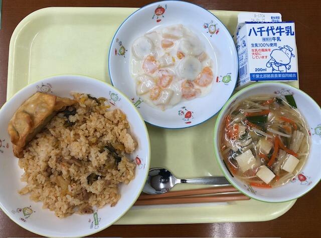 今日の給食の献立は、牛乳、フルーツヨーグルト、揚げ餃子、キムチご飯、春雨スープでした。