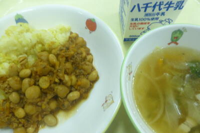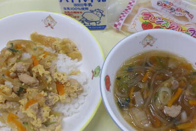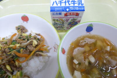 ここで問題です。今日の給食のビビンバに入っている黄色の食材は何でしょう?みなさん、わかりましたか?