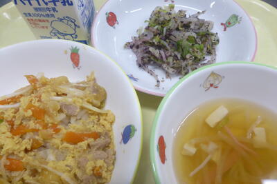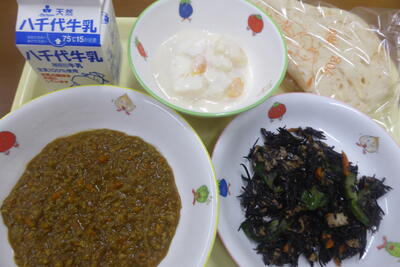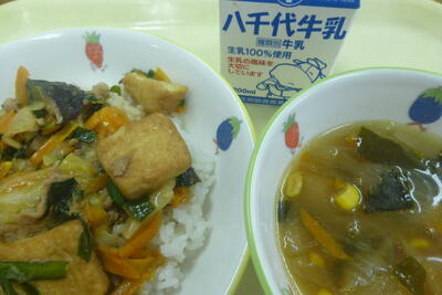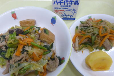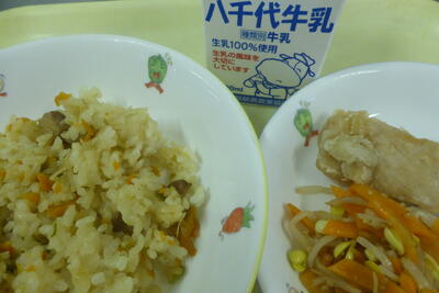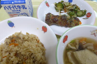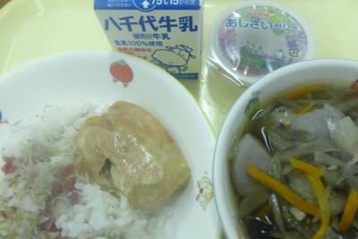 今日の給食では、噛(か)みごたえのある「いか」や、切干大根を使用しました。噛むことを意識して食べてみましょう