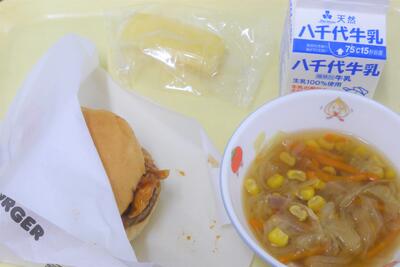 今日のハンバーガーはチーズをはさんだチーズバーガーです。チーズには骨や歯を丈夫にするカルシウムがたっぷりです。成長期のみなさんにぜひ食べてほしい食材の一つです。