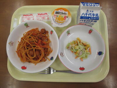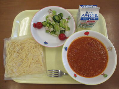 ・ミートソーススパゲティ・えだまめサラダ・ミニトマト・ぎゅうにゅう です。