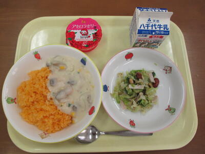オレンジ色 が鮮 やかなケチャップライスにかけるのはえびクリームソースです。クリームソースは牛乳・バター・小麦粉 を使用 して給食室 で手作 りしました。濃厚(のうこう) なソースでとても美味 しく仕上 がりました。エビのうまみもあじわいましょう。