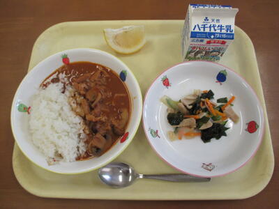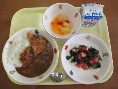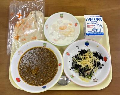 <献立>・ポークカレー(ごはん) ・ひじきのマリネ ・クレープ ・牛乳