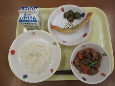 ・ごはん・さばのカレーやき・にくじゃが・ごぼうサラダ・ぎゅうにゅう です。