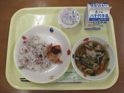 赤飯 にはささげという豆 を使 ってきれいな紅(べに) いろが出 るよう調理員 さんが給食室 で炊 いてくれました。ささげは大角(ささ)豆(げ)とも呼ばれ、煮豆やあんにも、つかわれることがあります。