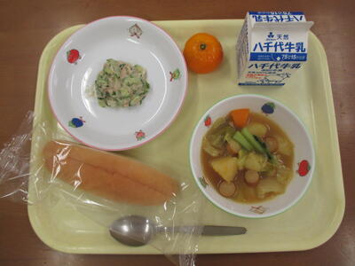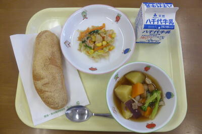 ・きなこあげぱん・こまつなとツナのあえもの・あきやさいのポトフ