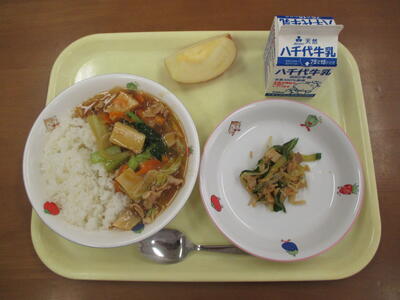 <献立>・マーボー豆腐どん(ごはん) ・まめもやしの中華和え ・カクテルゼリー ・牛乳