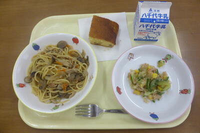 ・わふうきのこスパゲッティ・かにかまサラダ・マロンケーキ