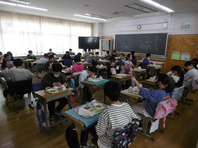 2~6年生の給食がスタートしました!子どもたちが、心待ちにしていた給食。初日の献立は、「牛乳、きなこあげパン、焼肉サラダ、ワンタンスープ、パリッシュ」…子どもたちの人気メニューがずらり勢揃い!おいしい給食に自然に笑みがこぼれていました。作ってくださった方々に感謝して食べましょう!1年生の給食は、17日から始まります。小学校生活初めて食べる給食のメニューは、…もちろん、カレーライスです!