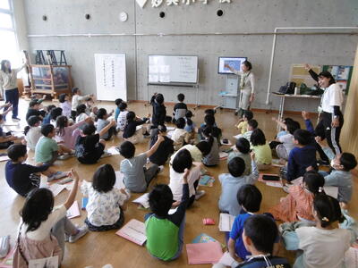 3年生になって初めて学習するのが、「外国語活動」です。担任の先生と外国語活動指導員の先生によるティーム・ティーチングで指導の充実を図っています。3年生の学習目標は、英語を聞いたり話したりしながら、コミュニケーションの楽しさを味わうとともに、異なる文化について理解することにあります。子どもたちは、初めての英語学習に意欲満々!英語で互いにあいさつをしたり、1から20までのナンバーソングを歌ったり、気持ちを表す言葉クイズをしたりしながら、友だちと一緒に楽しく学習に取り組んでいます。