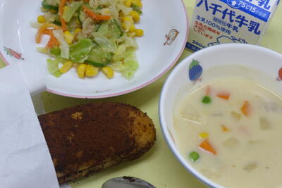 正解は・・・黄色いかまぼこです!正解した人はいますか?このようにただ給食を食べるだけではなく、何の食材が入っているか考えて食べてみてください。