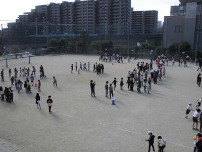 写真は、遊んでいる様子→放送が流れた直後→校庭の中央に集まって頭を守っている様子 です。