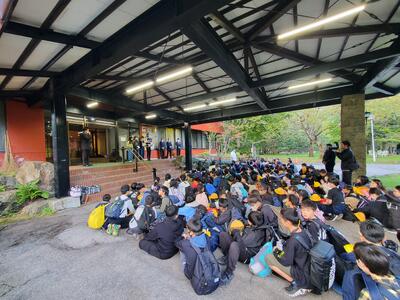 朝からアリーナで声出しをした後、文化会館に向けて出発!