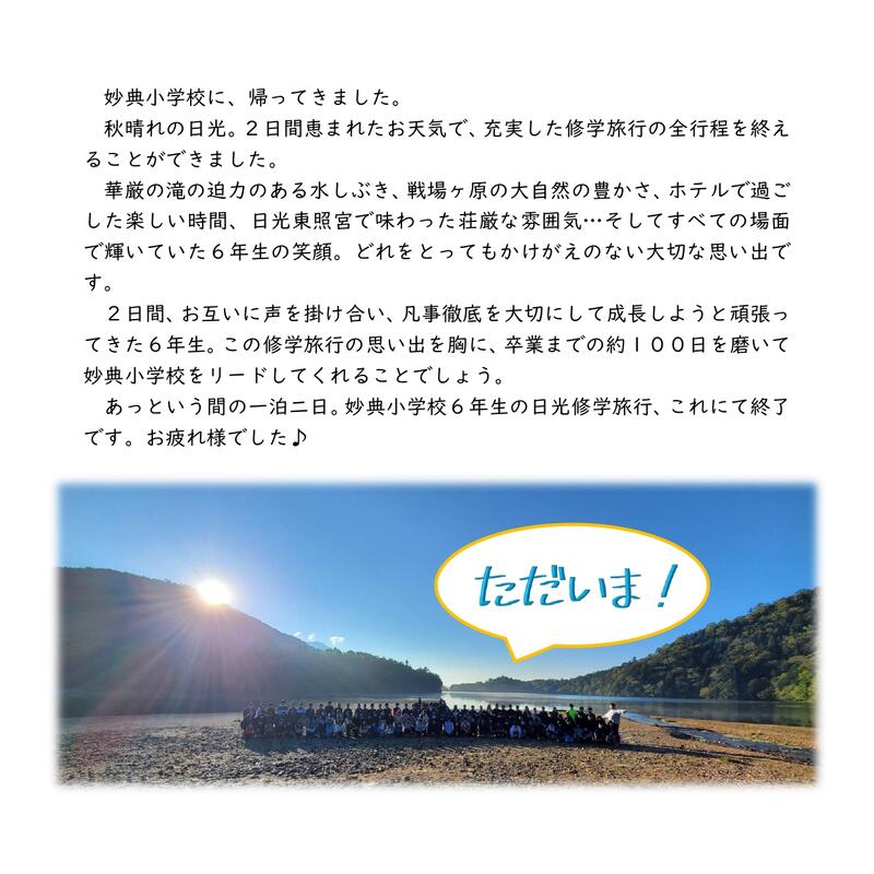 妙典小学校に帰ってきました。グループで協力して、楽しく見学できました。この校外学習で学んだことを生かして、後期もがんばっていきましょう!