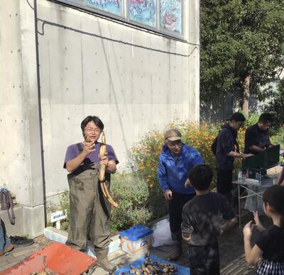学校では、妙典小ハス田クラブのみなさんがハスの収穫に挑みました。