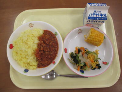 今日のとうもろこしは千葉県産のとうもろこしです。ゴールドラッシュという品種です。1時間目の時間には2年生とはあと学級のみなさんに皮むきをしてもらいました。全校分で220本です。感謝の気持ちを持って旬の味を味わいましょう!