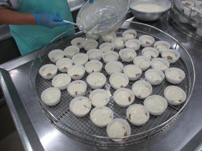 世界にはチェダーやモッツァレラ、カマンベールなど、1000種以上のチーズがあるといわれています。色や風味、かたさ、食感の違いは原料乳(げんりょうにゅう)(牛、やぎ、水牛など)や熟成(じゅくせい)方法(ほうほう) などによるものです。今日 の献立 のチーズポテトは給食室 で手作 りしました。おいしくいただきましょう!