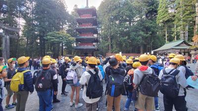 グループ見学がおわり、五重塔に集合しました。この五重塔、中心の柱「心柱」がポイントです。地面についていない柱で、免震装置になっています。この知恵を現代とある建造物に生かしています。いま、子どもたちがいるのは、その建造物と同じくらいの高さだそうです。