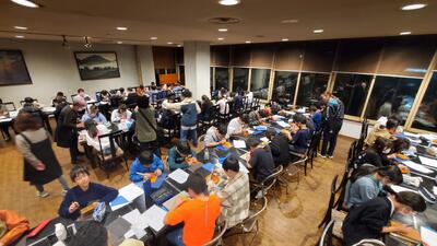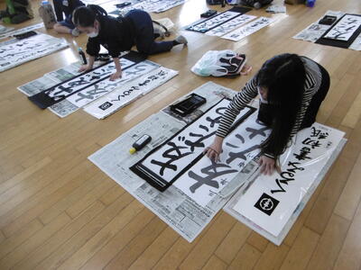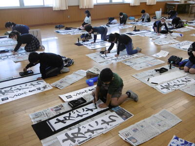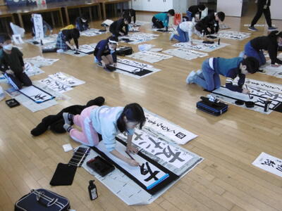 年末が近づくと始まるのが、「書初め」練習です。3年生のほとんどの子どもたちにとっては、「書初め」は初体験!広いランチルームの床の上で、書初め用の太筆を手に、大きな書初め用紙に挑みます。3年生の課題は「友だち」です。机の上で書くのとはだいぶ勝手が違うので、道具の準備をするのも大変です。いざ始まると、子どもたちは、最初こそ、かなり戸惑っていましたが、先生のお話をしっかりと聞きながら、「とめ」、「はね」、「はらい」等を意識して、少しずつスムーズに筆を動かせようになってきました。日本の伝統文化である「書初め」のよさや楽しさを十分味わってほしいと思います。年明けには、書初め大会を開催する予定です。ご家庭でも、できる範囲で伝統文化に触れさせてあげてください。
