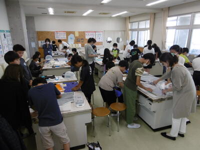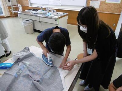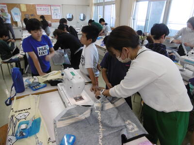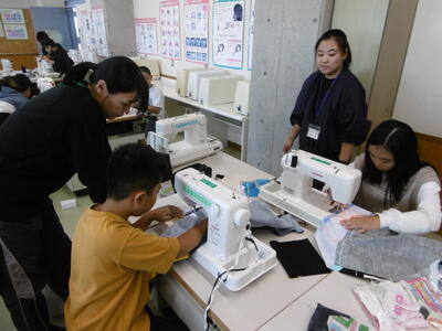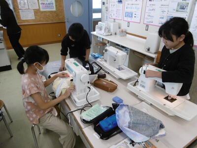 5年生では、家庭科の学習で「生活を豊かにするための布を用いた製作」として、エプロンづくりに取り組んでいます。製作をとおして、手縫いやミシン縫いなど、目的に応じた縫い方や用具の安全な取り扱いについて学びます。大多数の子どもたちは、ミシン縫いはもちろん、本格的な手縫いも初体験です。自分の体の大きさに合わせて、エプロンの丈を縫う位置を決めて、手縫いやミシ縫いにチャレンジ!最初こそ、かなり手間取っていましたが、「お手伝いボランティア」の保護者の方々が、一人一人を丁寧にサポートしてくださったおかげで、ミシン縫いにも少しずつ慣れ、楽しく取り組んでいます。子どもたちの力作が完成するのが楽しみです!ご多用の中、サポートをしていただいた保護者の皆様、ありがとうございました。
