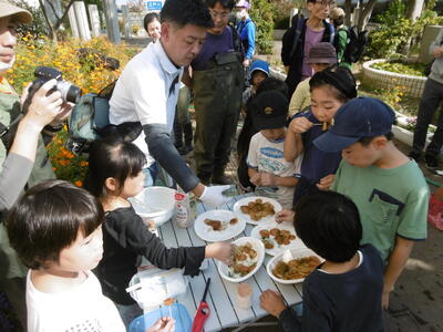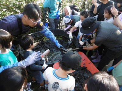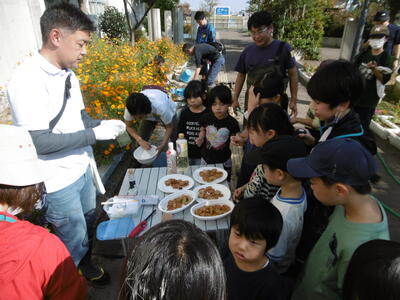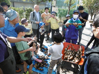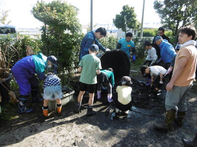 「妙典小ハス田クラブ」の皆さんが「レンコンの収穫体験」をしました。参加した子どもたちは、元ハス農家の篠田務さんや地域学校協働活動推進員の安達さんをはじめ、環境保護団体「三番瀬フォーラム」の皆さんのサポートのもと、作業を開始。まずは、みんなで協力してハス池の水をバケツリレーで汲み出し、水が少なくなったところで、ハス池の中から、手探りでレンコンを掘り当てていきます。子どもたちは、泥んこになりながら、「とったど~!」「これ、大きい!」と、次々にレンコンを手にして大はしゃぎ。掘ってみるまでレンコンができているかどうか心配でしたが、思わぬ大豊作!苦労して収穫したハスは、その場でバターしょう油風味の「レンコン・ステーキ」にして、試食しました。「おいし~い!」ホクホクとした食感とほのかな甘味に、子どもたちも笑顔いっぱいでした。子どもたちにとっては、地域の文化や自然に触れることのできる貴重な体験ですね。来年の植え付け、収穫も楽しみです。なお、「妙典小ハス田クラブ」の活動の様子を撮影した写真を妙典小教室棟1階に掲示しています。ぜひ、ご覧ください。
