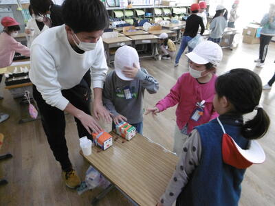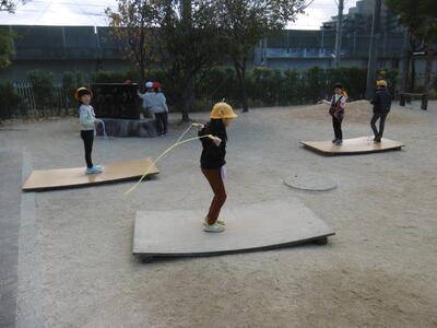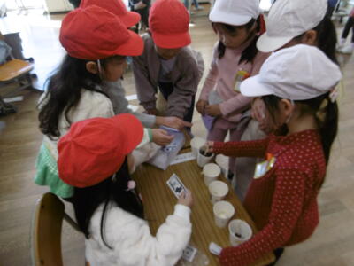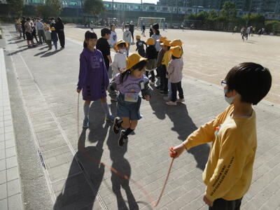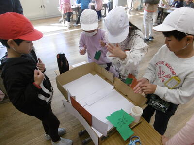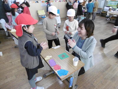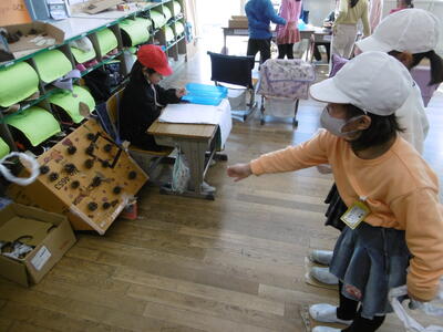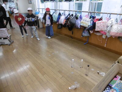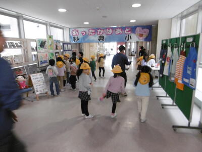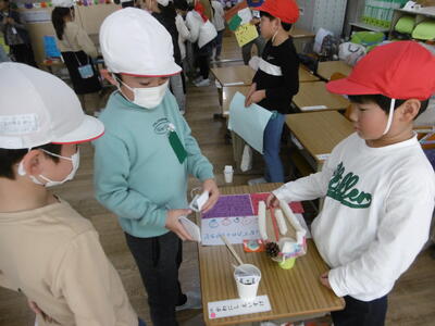 1年生が生活科で取り組んできた「あきとなかよし」もいよいよクライマックス!子どもたちは、これまで自分たちで工夫しながら手作りした「秋のおもちゃ」で、「秋まつり」を楽しみました。お客さんとお店の人を交代しながら、お互いが作ったおもちゃで夢中になって遊んでいます。お店の人になったときは、「いらっしゃい!」「やってみてください」「楽しいですよ!」など、呼び込みの声も元気いっぱい!秋まつりを大いに満喫していました。