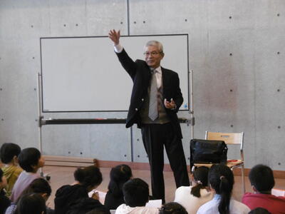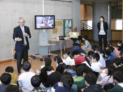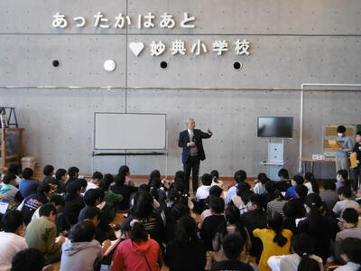 創立25周年を迎えた今年度、5年生では総合的な学習の時間に、妙典小学校についての探究学習をしています。母校とはいえ、知っているようで知らない謎がいっぱい!子どもたちは、その謎を解明しようと、これまで、校舎をデザインした設計士の中島さんや前校長の田中先生をお招きして、お話を伺ってきました。さらに、12月8日には、初代校長の横田先生にもお越しいただきました!写真でしか見たことがない校長先生の登場に、子どもたちは、拍手喝采!大興奮!もちろん、校歌を作詞した先生だということは、みんなが知っています。横田校長先生が、やさしいまなざしと笑顔で、開校当時の地域や学校の様子はもちろん、「あったかはあと」の意味や由来、校歌に込めた思いや願いなどを、詳しくお話してくださいました。初代校長先生とのあったかはあとな交流に、子どもたちは、母校への愛情をいっそう深めたことでしょう。