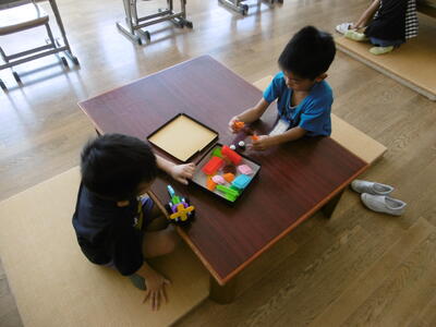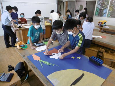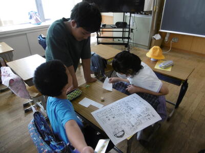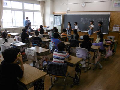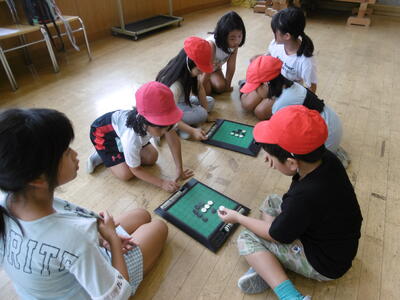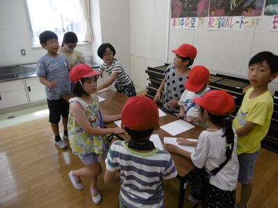 なぞなぞ、クイズ、フルーツバスケット、マジカルバナナ、爆弾ゲーム、色紙、オセロ、落語…。どのグループも笑顔いっぱい!4年生が2年生を上手にサポートしながら、仲良く楽しく遊んでいます。もちろん、小さなトラブルは必ずと言ってよいほど発生します。トラブルが起きたらどうすればよいのか、どうすれば、みんなが楽しく遊べるのか…。近年、生活様式の変化や少子化により、地域において異年齢の集団で遊んだり活動したりする機会が目に見えて減少しています。このことが、子どもたちのいわゆる「社会性」の未熟さの一因になっているという指摘もあります。上級生への憧れや尊敬、下級生から頼られる自己有用感、小さき者や弱い者への慈しみや優しさ、違いを認め合う意識や上手に折り合いをつける力等、異年齢集団での遊びや活動を通して学んでいく力は、少なくありません。学校の教育活動に意図的かつ継続的に取入れていくことで、子どもたちに、社会性を育んでいきたいと思います。