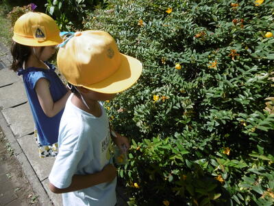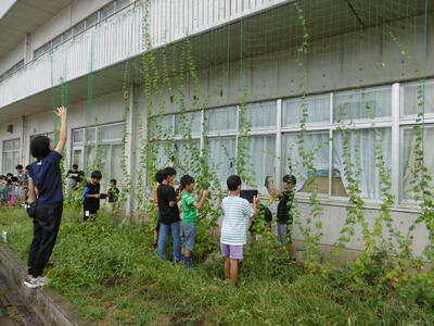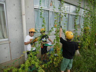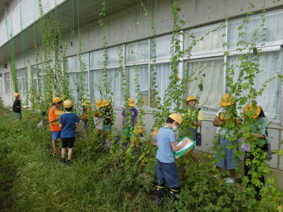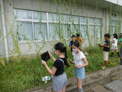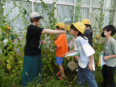 夏野菜の王様ツルレイシが、夏の日差しをたっぷり浴びてぐんぐんとツルを伸ばし、たくさんの実(ゴーヤ)をつけました。「想像していたよりもずっと固いよ!」4年生の子どもたちは、ごつごつとした手触りに驚きながらも、実の大きさ、形、におい、数などを熱心に観察して記録していました。